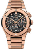 45 mm polished and satin-finished 18K King Gold case, polished and satin-finished 18K King Gold bezel, sapphire crystal with anti-reflective treatment, sapphire dial, HUB 1155 self-winding skeleton chronograph movement, approximately 42 hours of power reserve, satin-finished and polished 18K King Gold bracelet, 18K King Gold deployant buckle. Water resistant to 50 m.