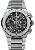 45 mm polished and satin-finished titanium case, polished and satin-finished titanium bezel, sapphire crystal with anti-reflective treatment, sapphire dial, HUB 1155 self-winding skeleton chronograph movement, approximately 42 hours of power reserve, satin-finished and polished titanium bracelet, titanium deployant buckle. Water resistant to 50 m.
