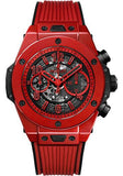 45 mm polished red ceramic case, black ceramic back, black composite resin lateral inserts and bezel end pieces, polished red ceramic bezel with 6 H-shaped screws, sapphire crystal with anti-reflective treatment, skeleton mat red dial with red appliques and black luminescent, HUB 1242 self-winding movement with flyback chronograph with column wheel and date, approximately 72 hours of power reserve, black and red structured lined rubber strap, black PVD titanium with black ceramic insert deployant buckle. Water resistant to 100 meters.