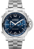 44mm AISI 316L brushed steel case, polished steel bezel, blue sun-brushed dial with luminous arabic numerals and hour markers, hollowed chronograph minutes counter at 3 o’clock and small seconds counter at 9 o’clock, central chronograph seconds hands, tachymeter scale in the external “rehaut”, P.9200 calibre automatic movement, steel bracelet. Water resistant to 10 bar (~100 metres).