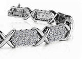 The item exclusively features Lab-Grown Diamonds in FG/VS quality, ensuring premium quality and ethical sourcing. For any inquiries regarding the quality of the stones, please feel free to contact us. Wrap your wrist with this elegant design featuring a triple row of shimmering round diamonds, each intersected by a shiny X shape.