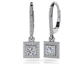 This item features exclusively high-quality natural diamonds, ensuring superior quality and ethical sourcing. For more information about the diamond quality, please do not hesitate to contact us. These diamond drop earrings feature a diamond lined lever back with a square shaped drop portion below. The drop portion contains a stunning princess cut diamond bordered by smaller round diamonds. A secure prong setting holds each diamond in place. Customize in gold or platinum and choice of 4 carat sizes including .58, 1.21, 1.62, and 2.11.