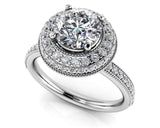 This item features exclusively high-quality natural diamonds, ensuring superior quality and ethical sourcing. For more information about the diamond quality, please do not hesitate to contact us. You'll fall in love with the beauty of this vintage inspired diamond engagement ring! A beautiful round center diamond is set with a four prong design and surrounded by a double row of round diamonds. Millgrain edging adds a vintage style to the ring head and shank. You can choose from five sizes including .92, 1.20, 1.46, 1.75, and 2.00 total diamond carat weights. Plus, you can customize this dazzling diamond ring in white gold, yellow gold or platinum for an exceptional item that will remind her why she fell in love with you, time and time again! "