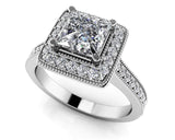 This item features exclusively high-quality natural diamonds, ensuring superior quality and ethical sourcing. For more information about the diamond quality, please do not hesitate to contact us. This diamond engagement ring features a stunning princess cut diamond set with four prongs and surrounded by smaller diamonds. The ring head has a complimentary square shape to it, which further enhances the beauty of the princess cut diamond. This ring features more round diamonds set along the ring shank and millgrain edging for a unique and sparkly design. Customize this ring in your favorite metal type and choose between five sizes including .78, .97, 1.34, 1.59, and 1.84 total diamond carat weights. "