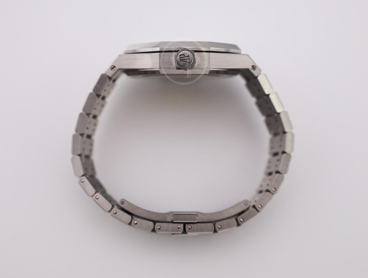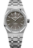 37mm stainless steel case, 9.8mm thick, glareproofed sapphire crystal back, diamond-set bezel, glareproofed sapphire crystal, grey ruthenium-toned dial with Grande Tapisserie” pattern, white gold applied hour-markers and Royal Oak hands with luminescent coating, Calibre 3120 selfwinding movement with dive-time measurement, hours, minutes, center seconds and date, approximately 60 hours of power reserve, stainless steel bracelet, AP folding buckle. Water resistant to 50 meters.