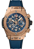 45 mm satin and polished 18K King gold case, satin-finished and polished 18K King gold bezel satin-finished and polished 18k king gold and 6 H-shaped titanium screws, black composite resin lower bezel, sapphire crystal with anti-reflective treatment, mat blue skeleton dial, HUB1242 UNICO self-winding movement with flyback chronograph and column wheel, approximately 72 hours of power reserve, black and blue structured lined rubber strap, 18K King gold and black-plated titanium deployant buckle. Water resistant to 100 meters.