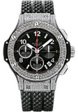 41mm stainless steel case set with 198 diamonds, stainless steel bezel set with 114 diamonds, black dial, self winding HUB 41 movement with chronograph function, approximately 42 hours of power reserve, black rubber strap with deployant buckle. Water resistant to 100 meters.