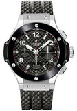 41mm stainless steel case, black ceramic bezel, black carbon stampd dial, self winding HUB 1145 movement with chronograph function, approximately 42 hours of power reserve, black rubber strap with deployant buckle. Water resistant to 100 meters.