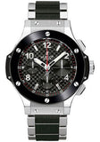 41mm stainless steel case, black ceramic bezel, black carbon stampd dial, self winding HUB 1145 movement with chronograph function, approximately 42 hours of power reserve, stainless steel and ceramic bracelet. Water resistant to 100 meters.