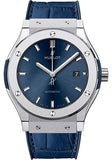 42 mm satin-finished and polished titanium case, satin-finished and polished titanium bezel with 6 H-shaped titanium screws, sapphire crystal with anti-reflective treatment, blue sunray dial, HUB 1110 self-winding movement, approximately 42 hours of power reserve, blue rubber and alligator strap, deployant buckle. Water resistant to 50 meters.