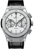 45 mm (available in 42 mm) polished and satin finished titanium case, vertical satin-finished titanium bezel with 6 H-shaped titanium screws, sapphire crystal with anti-reflective treatment, silver opalin dial with satin-finished rhodium-plated appliques and polished rhodium-plated hands, HUB1143 self-winding movement with chronograph, approximately 42 hours of power reserve, black rubber and alligator strap, stainless steel deployant buckle. Water resistant to 50 meters.