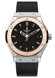 42mm zirconium case, 18K red gold and zirconium bezel, black dial, self winding HUB 1110 movement, approximately 42 hours of power reserve, black rubber strap with deployant buckle. Water resistant to 100 meters.