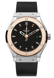 38mm zirconium case, 18K red gold bezel, black dial, quartz HUB 2910 movement, black rubber strap with deployant buckle. Water resistant to 100 meters.