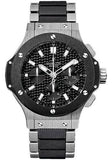 44mm stainless steel case, black ceramic bezel, black composite resin lateral inserts and bezel lugs, black carbon dial, self winding HUB 4100 movement with chronograph function, approximately 42 hours of power reserve, stainless steel and ceramic bracelet. Water resistant to 100 meters.