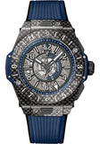 45 mm satin finished and carbon fibre case, 15.85 mm thick, sapphire crystal with anti-reflective treatment, silver skeleton dial, HUB 1251 Unico self-winding movement, approximately 72 hours of power reserve, black structured lined rubber strap, deployant buckle with one click" interchangeable system. Water resistant to 100 meters."