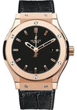 45mm 18K King red gold case, sapphire crystal back, 18K red gold bezel, black composite resin lateral inserts and bezel lugs, mat black dial, self winding HUB 1112 movement, approximately 42 hours of power reserve, black rubber and alligator strap with deployant buckle. Water resistant to 50 meters.