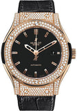 42mm 18K red gold case set with 228 diamonds (1.55ct), 18K red gold bezel set with 138 diamonds (1.12ct), black composite resin lateral inserts and bezel lugs, mat black dial, self winding HUB 1110 movement, approximately 42 hours of power reserve, black rubber and alligator strap with deployant buckle. Water resistant to 50 meters.