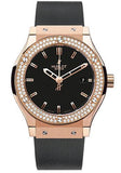 42mm 18K red gold case, 18K red gold bezel set with 138 diamonds (0.89ct), black dial, self winding HUB 1110 movement, approximately 42 hours of power reserve, black rubber strap with deployant buckle. Water resistant to 50 meters.