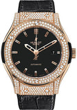 38mm 18K red gold case set with 218 diamonds (1.04ct), 18K red gold bezel set with 126 diamonds (1.00ct), black composite resin lateral inserts and bezel lugs, mat black dial, self winding HUB 1110 movement, approximately 42 hours of power reserve, black rubber and alligator strap with deployant buckle. Water resistant to 50 meters.