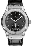 45 mm polished and satin-finished titanium case, vertical satin-finished titanium bezel with 6 H-shaped titanium screws, sapphire crystal with anti-reflective treatment, black dial with polished rhodium-plated appliques and hands, HUB1601 manual movement with reserve movement, approximately 192 hours / 8 days of power reserve, black rubber and alligator strap, stainless steel deployant buckle. Water resistant to 50 meters.