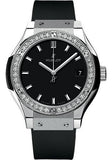 33 mm (available in 42 and 38 mm) satin finished and polished titanium case, polished titanium bezel, sapphire crystal, black dial, HUB2912 quartz movement, approximately 3 to 5 years of power reserve, black rubber and alligator strap, stainless steel deployant buckle. Water resistant to 50 meters.