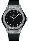 33 mm (available in 42 and 38 mm) polished titanium case set with 110 diamonds for 0.59cts, polished titanium bezel, sapphire crystal, black dial, HUB2912 quartz movement, approximately 3 to 5 years of power reserve, black rubber and alligator strap, stainless steel deployant buckle. Water resistant to 50 meters.