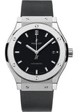 45mm polished and satin-finished titanium case, vertical satin-finished titanium bezel with 6 h-shaped titanium screws, sapphire crystal with anti-reflective treatment, mat black dial with satin-finished rhodium-plated appliques and polished rhodium-plated hands, HUB 1112 self-winding movement, approximately 42 hours of power reserve, black lined rubber strap, stainless steel deployant buckle. Water resistant to 50 m.