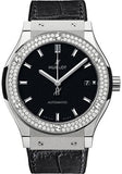 38mm titanium case, black composite resin lateral inserts and bezel end pieces, titanium bezel set with 126 diamonds (0.78ct), sapphire crystal, mat black dial with satin-finished rhodium-plated appliques and polished rhodium-plated hands, HUB 1110 self-winding movement, approximately 42 hours of power reserve, black rubber and alligator strap, deployant buckle. Water resistant to 50 meters.