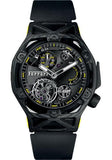 45 mm peek carbon fiber case with titanium screws, sapphire crystal with anti-reflective treatment, sapphire crystal and polished black dial, HUB6311 manual-winding movement with skeleton tourbillon chronograph, approximately 115 hours of power reserve, black smooth rubber strap, black-plated titanium deployant buckle. Water resistant to 30 meters.