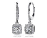 The item exclusively features Lab-Grown Diamonds in FG/VS quality, ensuring premium quality and ethical sourcing. For any inquiries regarding the quality of the stones, please feel free to contact us. These diamond drop earrings feature diamond lined lever backs with a square shaped drop portion dangling below. Each drop portion contains a lovely princess cut diamond, accented with smaller round diamonds around the perimeter. These earrings have incredible sparkle and can be customized in your choice of gold or platinum and three carat sizes. "