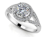 The item exclusively features Lab-Grown Diamonds in FG/VS quality, ensuring premium quality and ethical sourcing. For any inquiries regarding the quality of the stones, please feel free to contact us. This beautiful halo engagement ring features a brilliant round center diamond set with four prongs. The center stone is surrounded by a perfect halo of diamonds surrounding it. The split shank gives it a modern edge and is lined with additional diamonds. Choose from several sizes and metal types to create the engagement ring of her dreams!