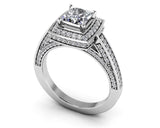 The item exclusively features Lab-Grown Diamonds in FG/VS quality, ensuring premium quality and ethical sourcing. For any inquiries regarding the quality of the stones, please feel free to contact us. This incredible diamond engagement ring features a princess cut center diamond bordered by smaller round diamonds set in a complementary square shaped design. The top and sides of the ring shank is lined with diamonds. Create the engagement ring of your dreams when customize this design in gold or platinum metal type and choice of total carat weights.