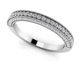 The item exclusively features Lab-Grown Diamonds in FG/VS quality, ensuring premium quality and ethical sourcing. For any inquiries regarding the quality of the stones, please feel free to contact us. This .51 carat diamond ring has a stylish look with millgrain edging that can be seen from the top and sides of the ring. There are 69 round diamonds set with prongs in your choice of gold or platinum. The diamonds set on the top of the ring are slightly larger in size than the diamond on the side. Create this diamond ring exactly as you please, and wear it as a perfect complement to an existing engagement ring or as an anniversary ring.