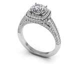 The item exclusively features Lab-Grown Diamonds in FG/VS quality, ensuring premium quality and ethical sourcing. For any inquiries regarding the quality of the stones, please feel free to contact us. This brilliant diamond engagement ring features a round center diamond bordered by smaller diamonds in a unique square shaped design. Additional round diamonds are set along the front and sides of the ring shank further enhancing this luminous design. Build your own engagement ring in gold or platinum metal type and choice of total carat weights.