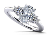 The item exclusively features Lab-Grown Diamonds in FG/VS quality, ensuring premium quality and ethical sourcing. For any inquiries regarding the quality of the stones, please feel free to contact us. This stunning 5 stone engagement ring features an oval shape diamond in the center, 2 baguette cut diamonds on the sides, and 2 smaller princess cut diamonds. The effect is spectacular. You may customize this ring further by selecting the type of metal of your choice, the diamond carat weight, diamond quality, and ring size.