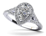 The item exclusively features Lab-Grown Diamonds in FG/VS quality, ensuring premium quality and ethical sourcing. For any inquiries regarding the quality of the stones, please feel free to contact us. This beautiful engagement ring features a pear shape diamond in the center, surrounded by brilliant cut round diamonds. The ring has a split shank towards the top with diamonds. Customize this beautiful ring by selecting the metal type of your choice, diamond quality, and size.