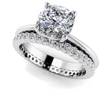 The item exclusively features Lab-Grown Diamonds in FG/VS quality, ensuring premium quality and ethical sourcing. For any inquiries regarding the quality of the stones, please feel free to contact us. This equisite bridal set shines eternally featuring the cushion solitaire diamond engagement ring as the heart of the flame. The gorgeous shared prong eternity band with 360 degrees of diamonds adds the perfect backlight to the cushion solitaire. Customize the bridal set to your exact taste by selecting the metal type, total carat weight, diamond quality and size.