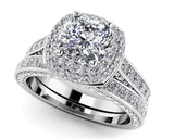 The item exclusively features Lab-Grown Diamonds in FG/VS quality, ensuring premium quality and ethical sourcing. For any inquiries regarding the quality of the stones, please feel free to contact us. Ignite your new journey with this beautiful cushion cut bridal set. A double halo of brilliant round diamonds surround the gorgeous cushion cut center stone. Sparkling round diamonds complete the look in their channel setting along the band. Available in several carat weights in your choice of gold or platinum setting.