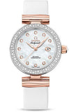 Omega De Ville Ladymatic Omega Co-Axial Watch - 34 mm Steel - Sedna Gold Case - Diamond Bezel - White Diamond Dial - White Leather Strap - 425.27.34.20.55.004