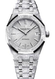 37mm hammered 18K white gold case, 9.8mm thick, sapphire crystal back, rhodium-toned dial with Grande Tapisserie pattern, white gold applied hour-markers and Royal Oak hands with luminescent coating, Manufacture Calibre 3120 selfwinding movement with hours, minutes, centre seconds and date, approximately 60 hours of power reserve, hammered 18K white gold bracelet, AP folding buckle. Water resistant to 50 m.