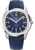 42.2 mm 18K white gold case, sapphire-crystal back, night blue embossed dial gradiated to black around the edges, caliber 324 S C self-winding movement with date in an aperture and center sweep second hand, approximately 35-45 hours of power reserve, midnight blue Tropical composite strap, Aquanaut fold-over buckle. Water resistant to 120 m.