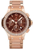 41mm 18K red gold case, 18K red gold bezel set with 114 diamonds, chocolate carbon dial, self winding HUB 4300 movement with chronograph function, approximately 42 hours of power reserve, 18K red gold bracelet. Water resistant to 100 meters.