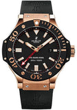 48mm 18K red gold case, black ceramic bezel with gold numbers, black dial, self winding HUB 41 movement with chronograph function, approximately 42 hours of power reserve, black rubber strap with deployant buckle. Water resistant to 100 meters.