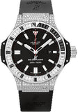 48mm palladium case, palladium bezel set with 42 baguette white diamonds and 30 baguette black diamonds, black dial, self winding HUB 21 movement, approximately 42 hours of power reserve, black rubber strap with deployant buckle. Water resistant to 300 meters.