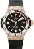 48mm 18K red gold case, 18K red gold rotating bezel set with 36 baguette white diamonds, 36 baguette black diamonds, 8 baguette rubis, black dial, self winding HUB 21 movement, approximately 42 hours of power reserve, black rubber strap with deployant buckle. Water resistant to 300 meters.