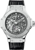 44mm platinum case, platinum bezel, black composite resin lateral inserts and bezel lugs, skeleton dial, manual winding HUB 8000 movement with minute repeater tourbillon,. Water resistant to .