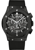 45 mm polished and satin-finished black ceramic case, vertical satin-finished black ceramic bezel with 6 H-shaped titanium screws, sapphire crystal with anti-reflective treatment, sapphire dial with polished rhodium-plated appliques and hands, HUB1155 self-winding movement with chronograph, approximately 42 hours of power reserve, black lined rubber strap, black PVD stainless steel deployant buckle. Water resistant to 50 meters.
