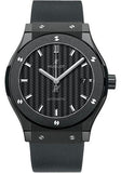 45 mm polished and satin-finished black ceramic case, vertical satin-finished black ceramic bezel with 6 H-shaped titanium screws, sapphire crystal with anti-reflective treatment, mat carbon fiber dial with polished rhodium-plated appliques and hands, HUB1112 self-winding movement, approximately 42 hours of power reserve, black lined rubber strap, black PVD stainless steel deployant buckle. Water resistant to 50 meters.