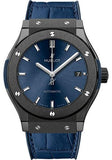 45 mm satin-finished and polished black ceramic case, satin-finished and polished black ceramic bezel with 6 H-shaped titanium screws, sapphire crystal with anti-reflective treatment, blue sunray dial, HUB 1112 self-winding movement, approximately 42 hours of power reserve, blue rubber and alligator strap, black-plated stainless steel deployant buckle. Water resistant to 50 meters.