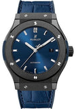 42 mm satin-finished and polished black ceramic case, satin-finished and polished black ceramic bezel with 6 H-shaped titanium screws, sapphire crystal with anti-reflective treatment, blue sunray dial, HUB 1110 self-winding movement, approximately 42 hours of power reserve, blue rubber and alligator strap, black-plated stainless steel deployant buckle. Water resistant to 50 meters.